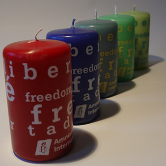 The word «freedom» is written in seven languages on the candles of Amnesty International. To remember that each human being is born free and equal