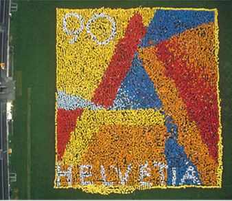 They connected this project with the national gymnastic meeting which was held yearly in Bern. This allowed them to find the 10'000 young people they needed for that project. Their idea was to recreate Jean-Benoit's stamp on a football field. Once the stamp was recreated, a picture would be made from an helicopter and than reproduced into a new stamp. The organization to dispatch and dress 10'000 people in a short period of time had to be very well prepared and needed a huge amount of voluntiers. Soon you will find the movie of the event on You-tube. For now, we can show you two pictures. One is the areal photography from the 10'070 people reconstructing our stamp and the other one is the image of it reprinted on a new stamp. The Guiness World record was to have over 10000 people in a postage stamp. The stamp was released in 1996 just after this event and every participant received a first day cover of it. Simple design sometimes become out of hands. |