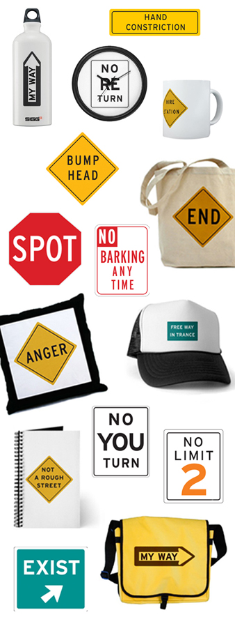 While reading the California Driver Handbook to pass his driver’s licence, Jean-Benoit transformed the meaning of some of the most known road signs crossed on the streets, by simply taking away or replacing one or two letters of the original and official versions. After this little twist, those signs become more personal and allow everyone to dream or smile or express themselves. Innerstate is now to wear at CafefPress, an online printing on demand website. All those signs have been applied on various visual artifact such as jackets, buttons, magnets, greeting- or postcards, T-shirt and much more. Some of the signs of this series are to be found in black and white at the font "Signal Signifier". |