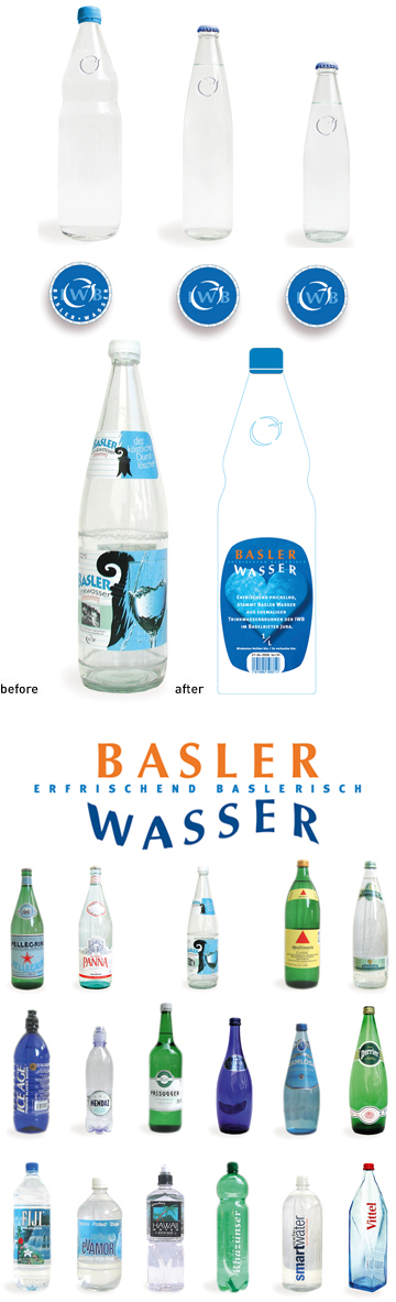 As the studio who developped the corporate image of the "IWB" – the Energy Company of the town of Basel – our team is used to respect the visual identity of this client and is flexible enough to expand the logo's imagery on other supports. A bottle of water was the perfect opportunity. While such assignment could give us the opportunity to increase the range of the "IWB" visual presence, it was expected from us to give our personal interpretation of the water. We understood quickly that as a proof of purity, the Basel Water is at the same time the metaphor of each other products at the IWB. Pure. Safe. Reliable. The Basel Water is pumped from a small natural source filtered and botteled by a local producer. It is sold manly in Basel and it's region. 3 agencies were brought to compete for a solution. The deliverable were first a logo for the product. Secondly a label that had to fit a given bottle. Developed within 2 intensive weeks with our team, this exploration shows our great interest toward beverages and products such as water. It demonstrate our ability to find quickly creative solutions. We developed 3 parts: A cap, a logo and the label. The top: Bottles lean either horizontally, or vertically in cases. In both situations, the first things ones sees is the cap of each bottle. Our first goal was to give an identity to the product by using the cap as one of the main recognizable element. For us the cap is like a hat, as the bottle stands for the body, the silhouette of the product. The mark: We studies ways to emboss the logo of IWB, so that the bottle carries the mark of a certain elegancy. For the logo, we used the idea of reflection in water. We combined the two words "Basler" and "Wasser" which contain the same amount of letters and when reversed to each other looks almost like the same word. The dress: The label had to fit a standard bottle which was inelegant and heavy looking. As an additional limitation, the format of the label was also given, so we found some additional surface at the back of the label, where all the secondary informations can be placed. The day we could work on such a particular product like water, was a great chance for our creativity. Such a simple product is delicate to design, as water is one of the most vital product in life. Accompanying us in each meal, water is an element which is present with each of us during our most important moments of the day. |