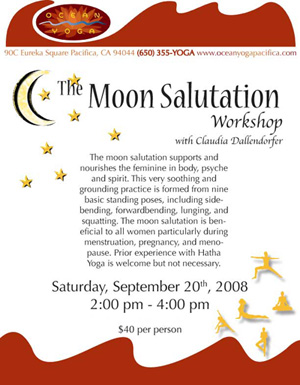 The moon salutation supports and nourishes the feminine in body, psyche and spirit. This very soothing and grounding practice is formed from nine basic standing poses, including side-bending, forwardbending, lunging, and squatting. The moon salutation is beneficial to all women during ( menstruation, pregnancy, menopause). Prior experience with Hatha Yoga is welcome but not necessary. Time:Saturday, Sep 20 & Oct 25, 2008